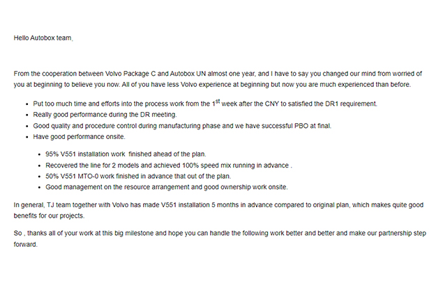 此次沃爾沃客戶的表揚信是對奧特博格項目團隊的最大褒獎,我們將化作奮進的動力:在汽車制造業(yè)中驅動前行,提供超越期待的服務,持續(xù)賦智賦能,與沃爾沃共成長,同心向未來。